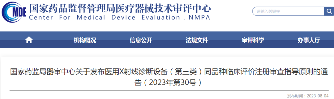 为进一步规范医用X射线诊断设备(第三类)的管理,国家药监局器审中心组织制定了《医用X射线诊断设备(第三类)同品种临床评价注册审查指导原则》,现予发布: