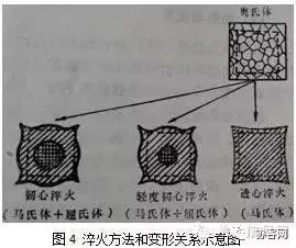 因冷却而导致的变形表现为以下几种形式:1件急冷初期,急冷的一侧凹陷,然后转为凸起,结果快冷的一面凸起,这种情况属于热应力引起的变形大于相变引起的变形。2由热应力所引起的变形是钢料趋于球形化(见图1),而由相变应力所引起的变形则使之趋于绕线轴状(见图2)。因此淬火冷却所致的变形表现为两者的结合(图3),按照淬火方式的不同,表现出不同的变形如图4所示。3仅对内孔部分淬火时,内孔收缩。将整个环形工件加热整体淬火时,其外径总是增大,而内径则根据尺寸的不同时涨时缩,一般内径大时,内孔涨大,内径小时,内孔收缩。五冷处理与变形