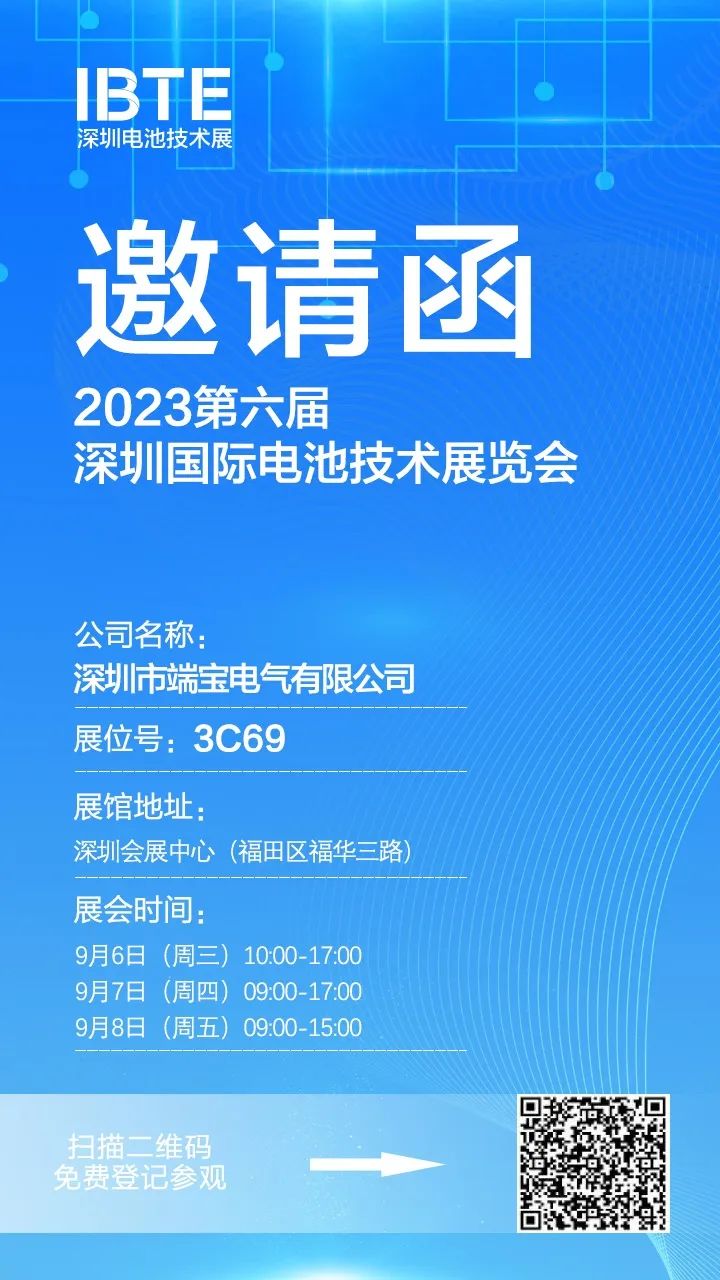 欢迎参加:2023第六届深圳国际电池技术展览会,简称:深圳电池技术展 IBTE,此会是中国首屈一指的专业电池技术展,专注于:电芯、材料、设备、展会由:深圳市电池行业协会、锂电百人会主办,上海贺励展览有限公司、贺励展览(深圳)有限公司承办!作为全球最具规模及影响力的国际电池产业链年度盛会,得到了国内外众多知名企业的认可,IBTE深圳电池技术展对中国电池行业的发展起到了积极的推动作用,已成为业内交流,学习,采购不可或缺的平台,同时展会将以展带会积极举办电池产业链高峰论坛,推动行业交流合作发展。