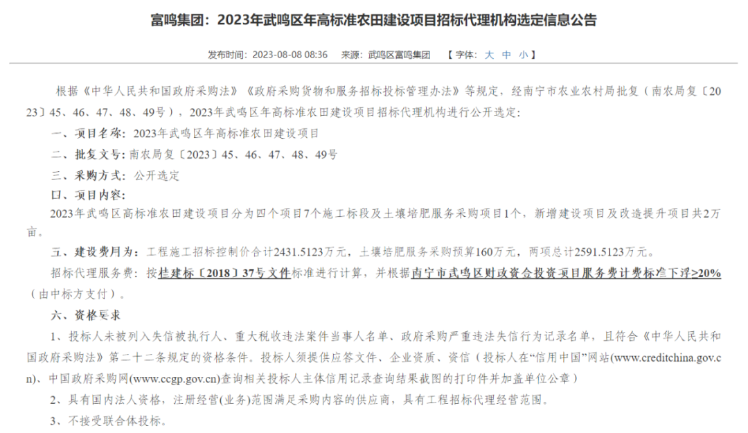 富鸣集团:2023年武鸣区年高标准农田建设项目招标代理机构选定信息公告