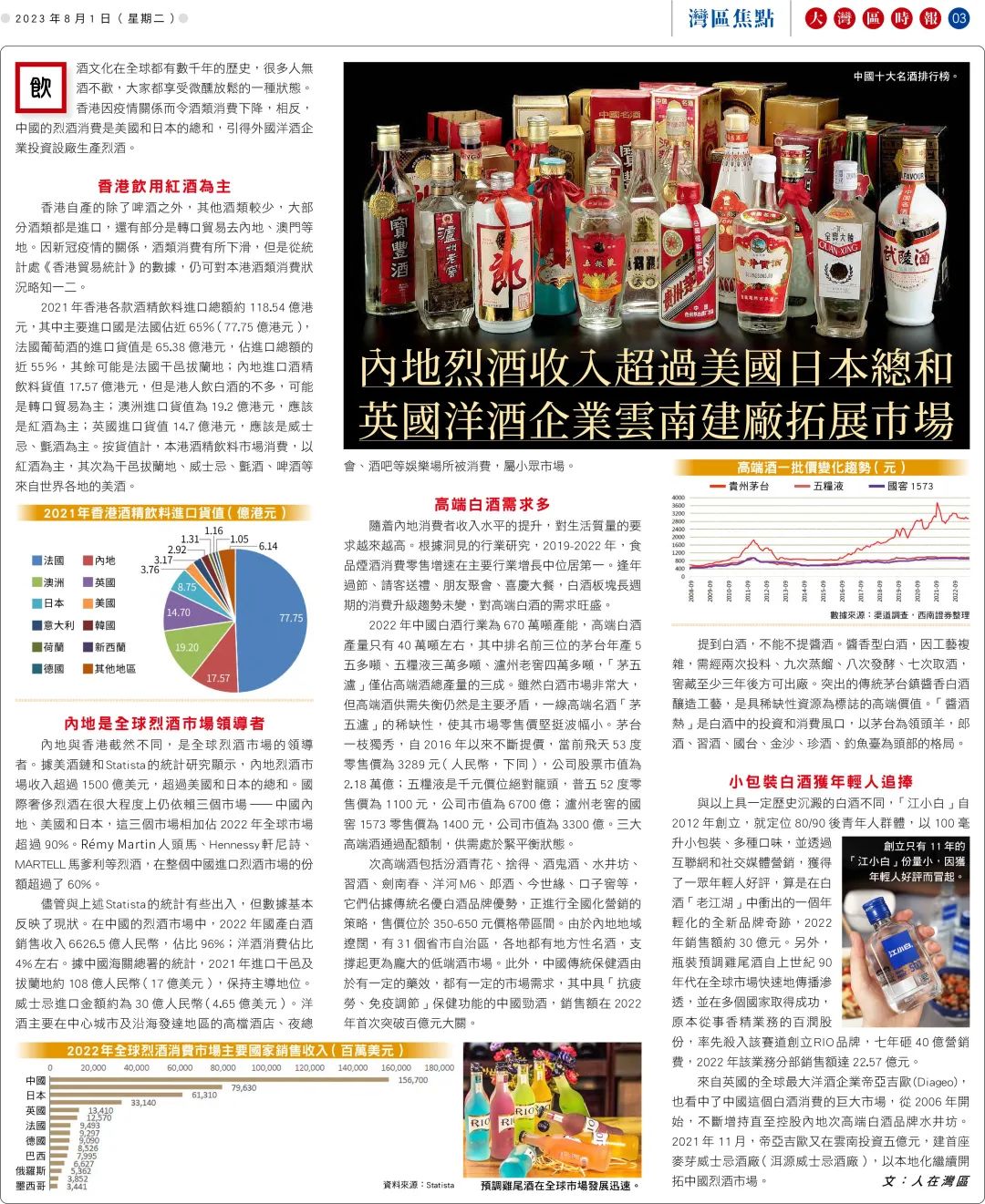 据香港大湾区时报报道:饮酒文化在全球都有数千年的历史,很多人无酒不欢,大家都享受微醺放松的一种状态。香港因疫情关系而令酒类消费下降,相反,中国的烈酒消费是美国和日本的总和,引得外国洋酒企业投资设厂生产烈酒。