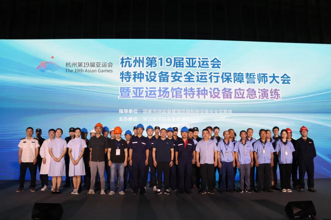 现场还举行了亚运会特种设备安全运行保障誓师大会,为“亚运特种设备应急处置先锋队”“技术保障先锋队”“公共救援先锋队”等三支亚运保障先锋队授旗,会上亚运会特种设备安保人员代表作表态发言。