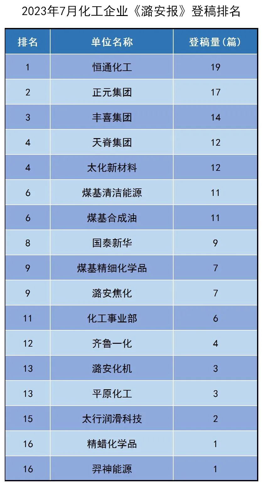 7月化工企业《潞安报》登稿排名 恒通 正元 丰喜位列前三