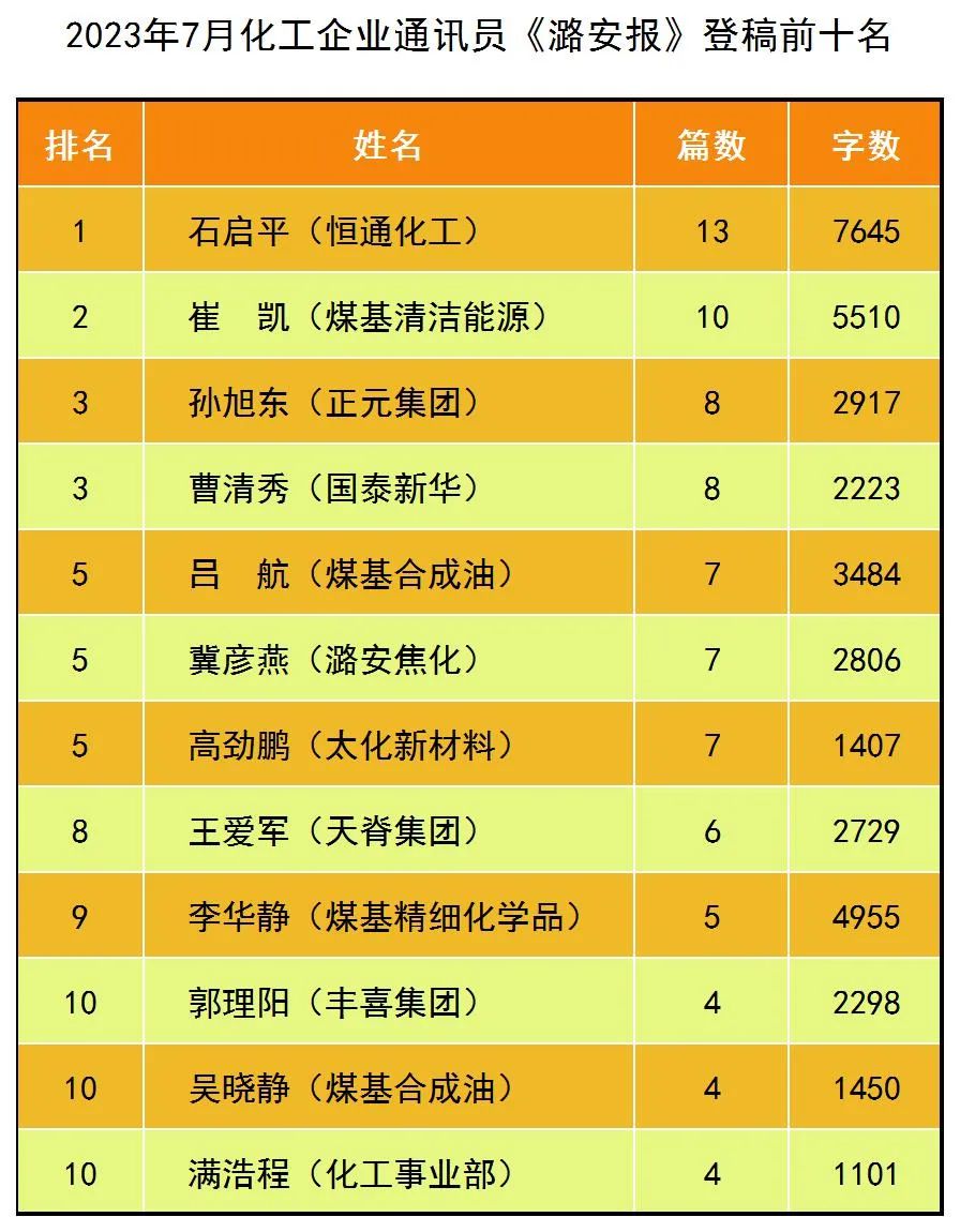 七月化工企业《潞安报》登稿排名