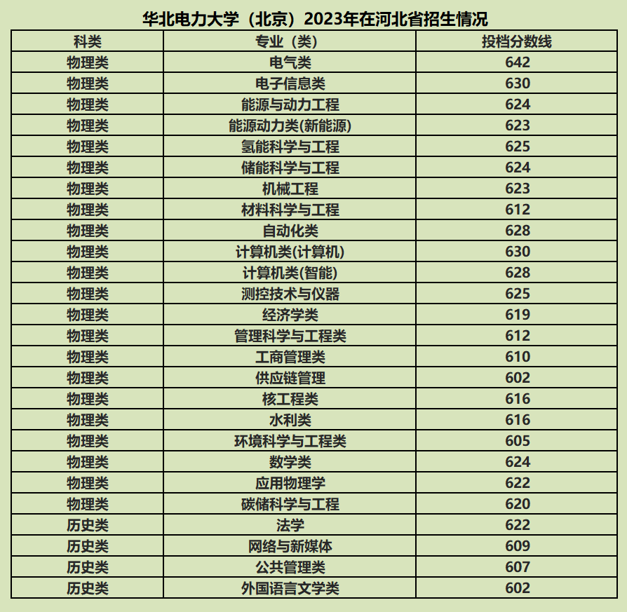 按照华北电力大学在河北省的招生情况,北京校区历史类最低录取分数线602分,对应河北省考生位次是2526名左右,物理类最低分对应河北省考生位次是14804名左右。保定校区历史类最低分588分,对应的考生位次是4056名左右,物理类最低分590分对应的位次是20607名左右。当然,不同专业之间的录取分数线有一定的差距,对于部分优势较大的专业,华北电力大学的录取分数线可能较高,比如电气工程类、电子信息类、自动化类,北京校区电气类642分对应河北省物理类考生3106名左右,保定校区626分对应河北省物理类考生6430名左右。