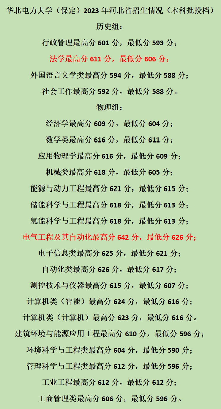 北京校区在北京市招生分数线较高的专业有电气类(物理),录取分数线为642分,除此之外,物理类招生专业分数线较高的还有电子信息类、计算机类(计算机)、自动化等。历史类招生专业并不多,除了上面说到的外国语言文学,还有法学专业,录取分数线622分,网络与新媒体录取分数线609分,公共管理类录取分数线607分。再来看保定校区在河北省招生情况,历史类专业中,录取分数线最低为588分,此分数线下录取的专业有社会工作、外国语言文学类,历史类专业中录取分数线较高的有法学专业,录取分数线为606分。