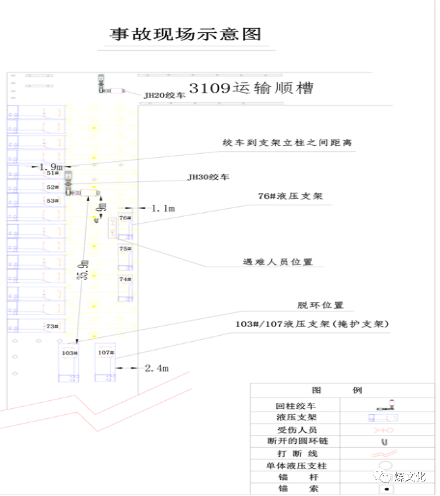 根据井下现场勘察及现场人员指认,结合调查取证笔录综合分析:本次事故是一起机电事故,事故发生位于3109工作面回撤通道距3109运输顺槽巷道口90米至92米、距煤帮3.1米处。事故发生时赵军、王飞站立在回撤通道煤帮侧放置的76#、75#液压支架左侧(在2#绞车绳道范围内,距2#绞车约12.5米处),被运行的2#绞车弹回的钢丝绳击中,倒在76#液压支架左侧底板处。