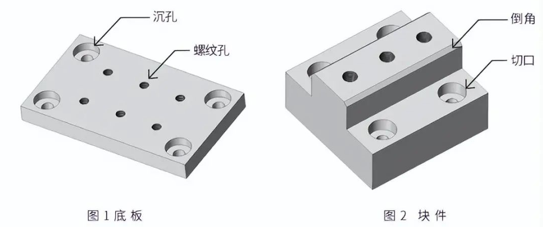 如下例所示,在平面上仅打螺丝孔或钻孔的底板或者局部有切口或倒角的块件等都是典型加工。除了孔和切口外,还可以加工轮廓和凹槽。