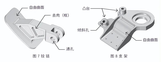 图 7 和图 8 是典型的航空零件的形状(示意图)。其特征在于,自由曲面和孔加工等组合、具有凸起、整体减薄形状等复杂的薄壁结构较多。