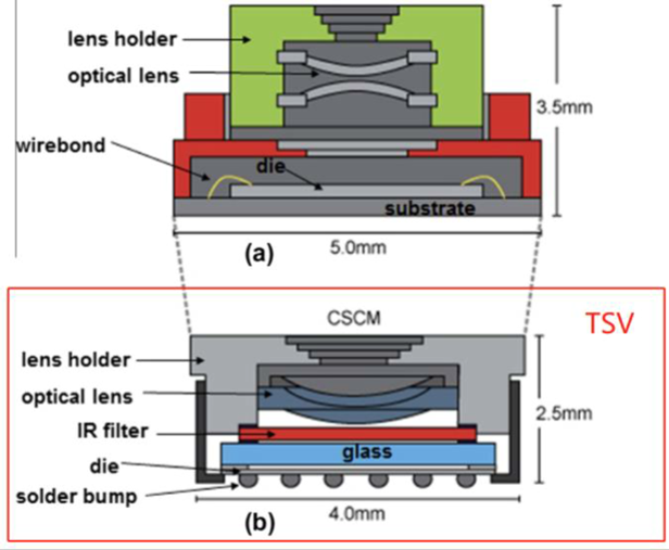 相机模组尺寸对比:带引线键合的图像传感器(a)VS 带 TSV 的图像传感器(b)