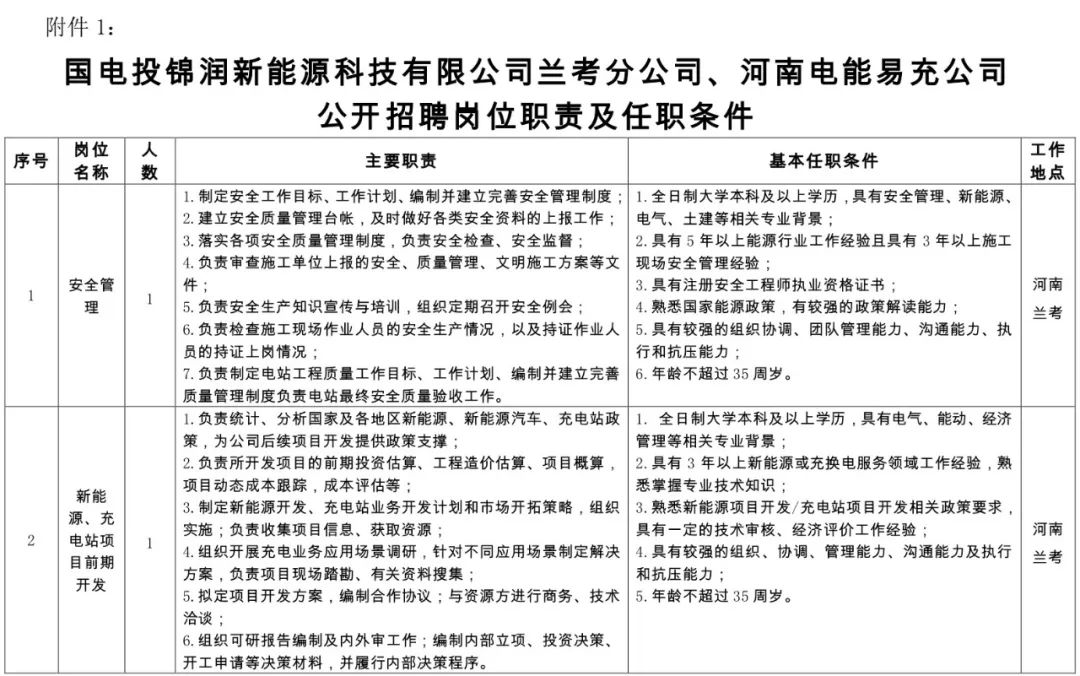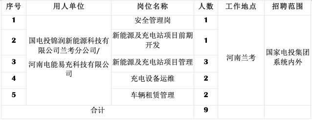 为加快推进公司新兴产业落地,保障各项经营管理工作有序开展,根据国电投锦润新能源科技有限公司兰考分公司、河南电能易充科技有限公司用人实际,现面向国家电投集团系统内、外公开选聘专业技术人员共9名。现将有关事项公告如下: