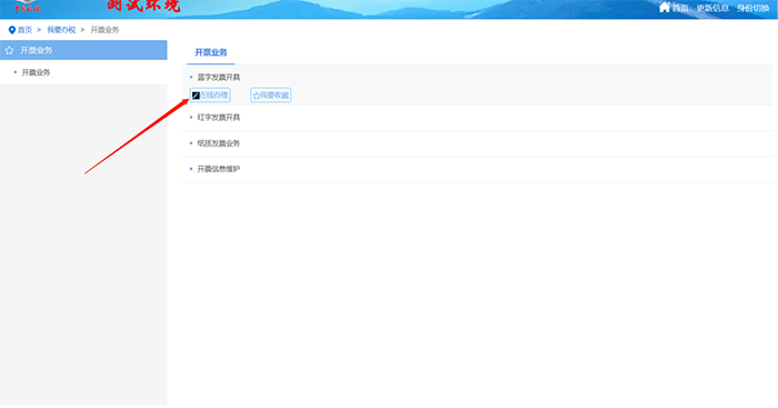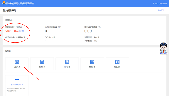 进入【我要办税】界面,点击【开票业务】->【蓝字发票开具】→【立即开票】。