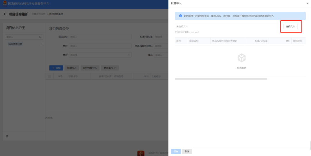 选择文件:从税控开票软件中导出的商品编码文件(txt/xml格式)。