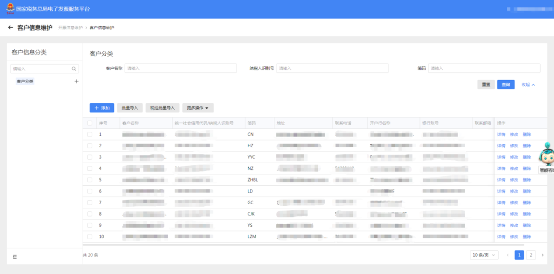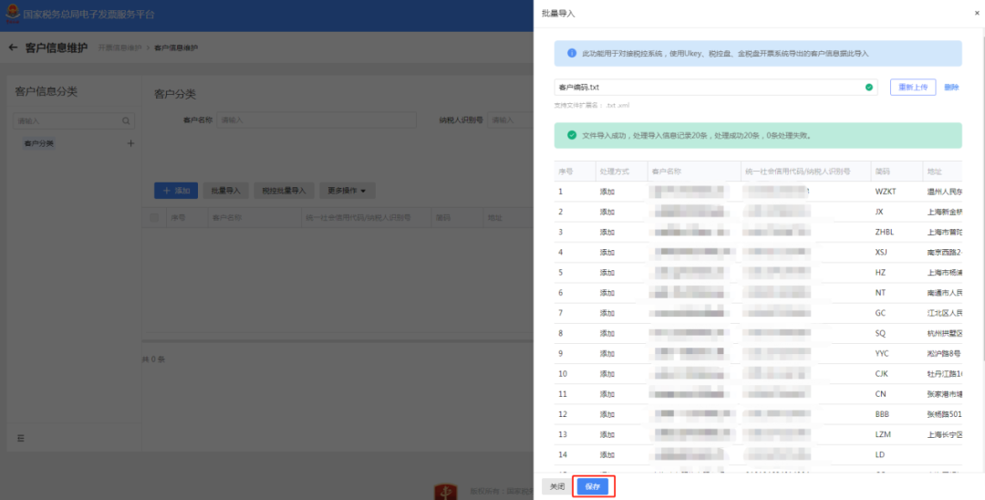 文件导入成功后点击“保存”,即完成客户信息维护。同时支持逐条信息的“详情、修改、删除”操作。