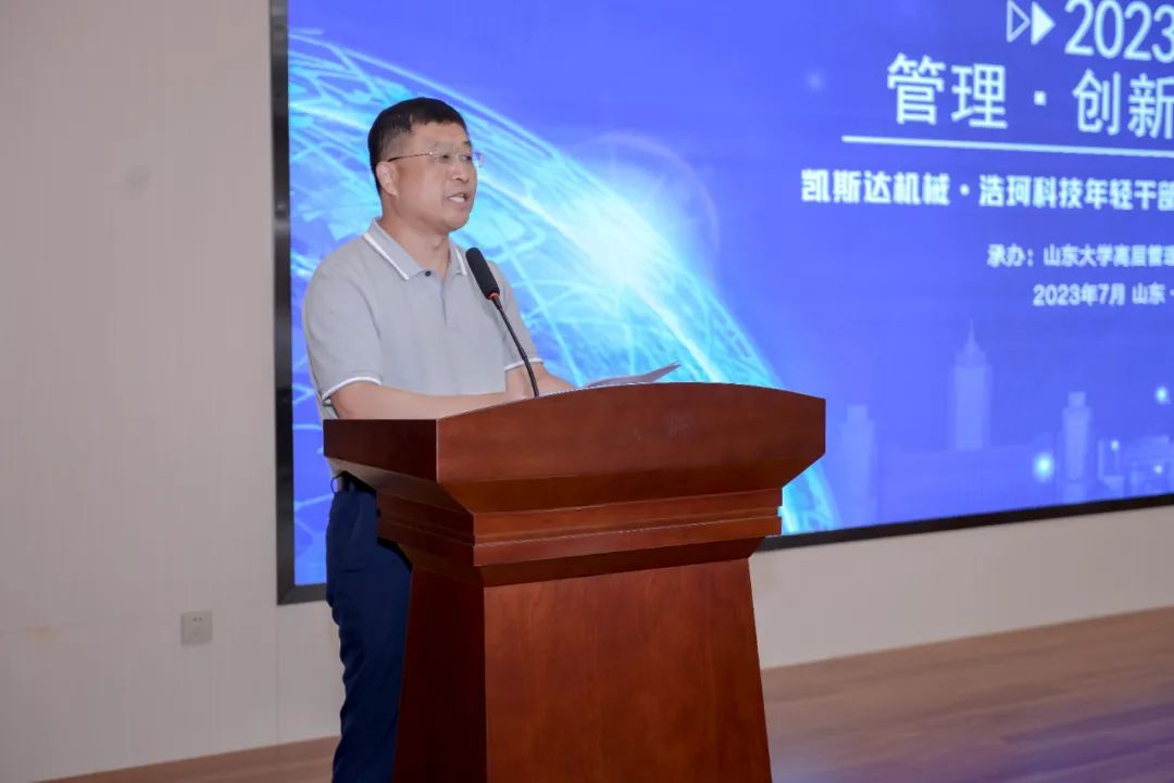7月29日,由山东大学管理学院举办的“2023‘管理•创新向未来’凯斯达机械•浩珂科技年轻干部综合能力提升研修班”在山东凯斯达机械制造有限公司举行开班仪式。济宁高新区党工委委员、组织部长刘伟宏、山东大学管理学院党委书记孟庆春、山东凯斯达机械制造有限公司董事长兼总经理张明、浩珂科技有限公司总经理崔鑫、全体学员出席开班仪式。