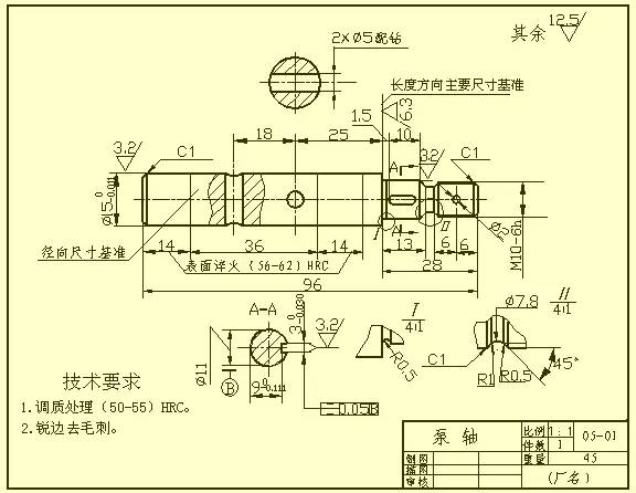 如图中所示的表面粗糙度为Ra6.3的右轴肩,被选为长度方向的主要尺寸基准,由此注出13、28、1.5和26.5等尺寸;再以右轴端为长度方向的辅助基,从而标注出轴的总长96。