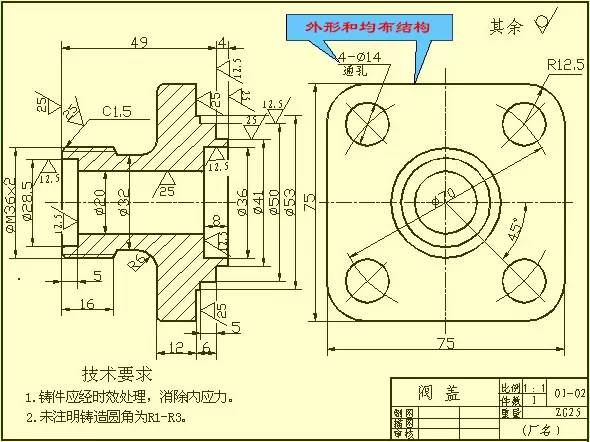 这类零件的基本形状是扁平的盘状,一般有端盖、阀盖、齿轮等零件,它们的主要结构大体上有回转体,通常还带有各种形状的凸缘、均布的圆孔和肋等局部结构。在视图选择时,一般选择过对称面或回转轴线的剖视图作主视图,同时还需增加适当的其它视图(如左视图、右视图或俯视图)把零件的外形和均布结构表达出来。如图中所示就增加了一个左视图,以表达带圆角的方形凸缘和四个均布的通孔。