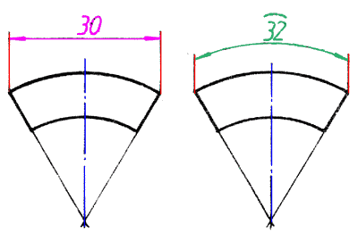 标注弦长和弧长时,如这两个例图所示,已寸界线应平行于弦的垂直平分线。标注弧长尺时,尺寸线用圆弧,并应在尺寸数字上方加注符号“^”。