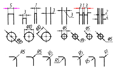 如上排图例所示,没有足够空间时,箭头可画在外面,或用小圆点代替两个箭头;尺寸数字也可写在外面或引出标注。圆和圆弧的小尺寸,可按下两徘例图标注。