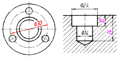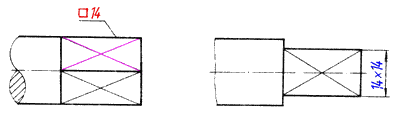如例图所示,标注机件的剖面为正方形结构的尺寸时,可在边长尺寸数字前加注符号“□”,或用14×14代替“□14”。图中相交的两条细实线是平面符号(当图形不能充分表达平面时,可用这个符号表示平面)。