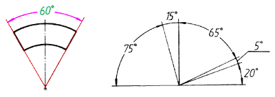 尺寸界线应沿径向引出,尺寸线画成圆弧,圆心是角的顶点。尺寸数字应一律水平书写,一般注在尺寸线的中断处,必要时也可按右图的形式标注。