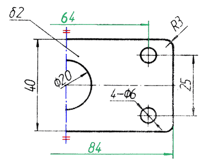 图上尺寸84和64,它们的尺寸线应略超过对称中心线或断裂处的边界线,仅在尺寸线的端画出箭头,在对称中心线两端分别画出的两条与其垂直的平行细实线(对称符号)。