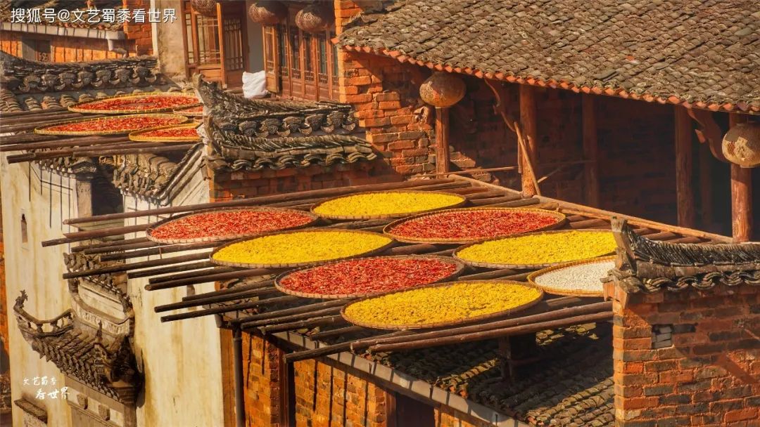 晒秋是一种典型的农俗现象,具有极强的地域特色。在湖南、广西、安徽、江西等生活在山区的村民,由于地势复杂,村庄平地极少,只好利用房前屋后及自家窗台屋顶架晒、挂晒农作物,久而久之就演变成一种传统农俗现象。