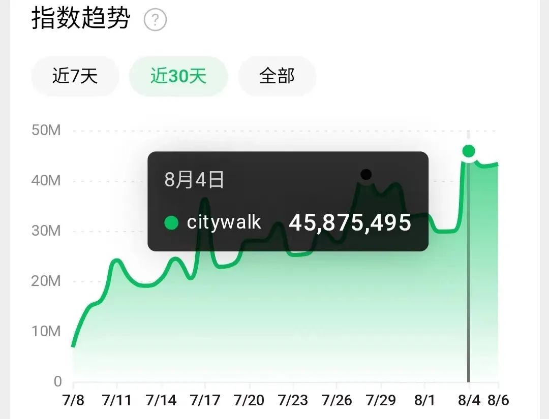 City Walk直译是“城市漫步”,是一种更为轻量级、短距离的城市旅行体验,在年轻人的语境里,泛指一切“出去找快乐”的行为。如多巴胺一样,City Walk也快速火遍全网,抖音话题已经有超7亿次播放,小红书上更是有60万+笔记。2023年上半年,小红书平台City Walk相关搜索量同比增长30倍。