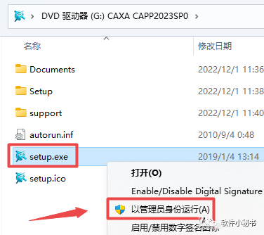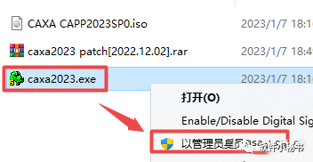 第10步:返回之前解压的“CAXA工艺图表2023”文件夹,鼠标右键点击“caxa2023.exe”选择“以管理员身份运行”,如下图所示。