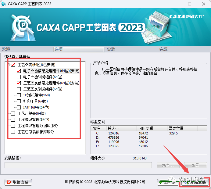 第6步:勾选“工艺图表”,点击“更改”可以选择软件安装路径,建议和教程中的保持一致,本例安装到D盘(将路径地址中的首字符C改为D表示安装到D盘,或者可以在其它磁盘里创建一个新的文件夹,安装路径不要出现中文),勾选其他需要安装的组件,点击“开始安装”,如下图所示。
