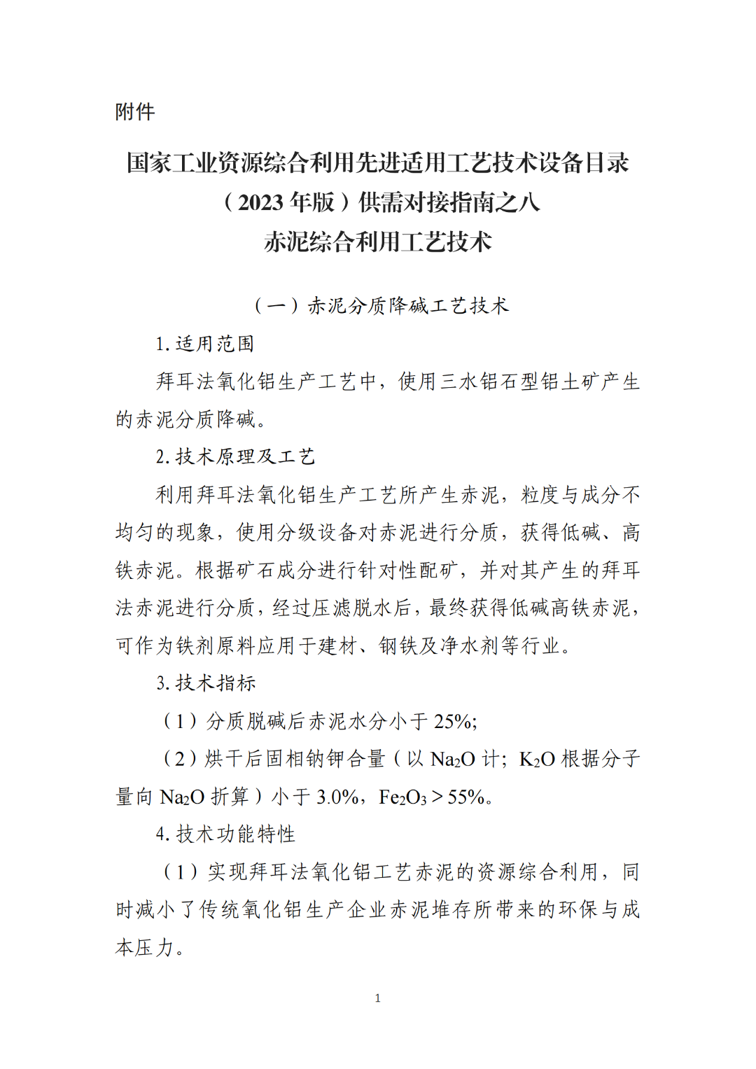 国家工业资源综合利用先进适用工艺技术设备目录(2023年版)供需对接指南之八:赤泥综合利用工艺技术
