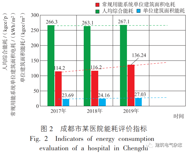 医院能耗的评价指标主要有单位建筑面积能耗(四川省地方标准DB51 / T 2762 - 2021《公共机构能耗定额标准》定义为运行过程中,一个自然年内,除交通工具用能之外消耗的各种能源实物量,折算为标准煤的总和与建筑面积的比值,单位为千克标准煤每平方米,kgce / m2),单位床位能耗(kgce / 床),单位业务量能耗(kgce / 业务量),单位收入能耗(kgce / 万元),人均综合能耗(DB51 / T 2762 - 2021定义为运行过程中,一个自然年内,消耗的各种能源实物量折算为标准煤的总和与用能人数的比值,单位为kgce / p),能耗费用占比(总能耗费用 / 总支出)等。