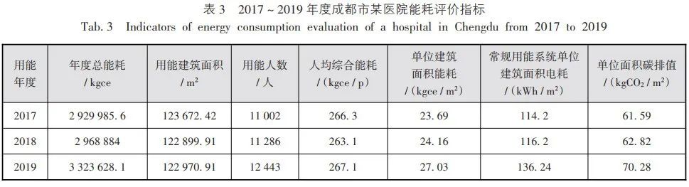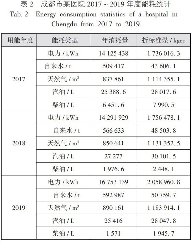 笔者调研了成都市内某三级甲等综合医院2017 ~ 2022年度的能耗数据,由于2020 ~ 2022年受新冠疫情影响,医院的门诊量和手术台数均受到不同程度影响,现以2017 ~ 2019年能耗数据为例(如表2所示),分析医院能耗现状。