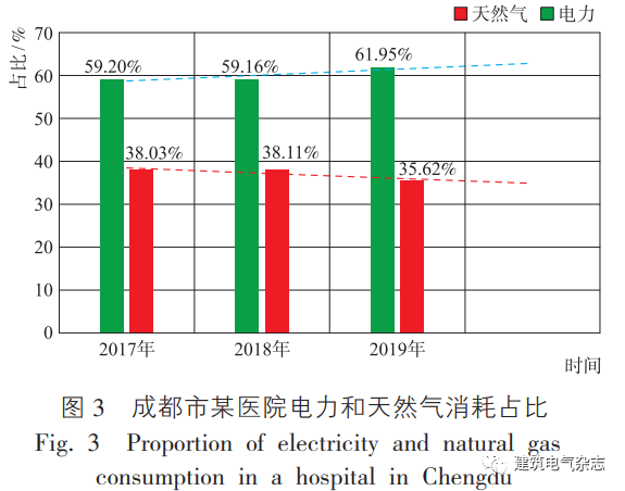 医院天然气主要消耗在生活热水、建筑采暖、餐饮系统、燃气锅炉系统等方面,约占总能耗的 25 %~ 35 %。各医院天然气能耗占比与是否采取集中供暖和建筑电气化水平有很大关系。