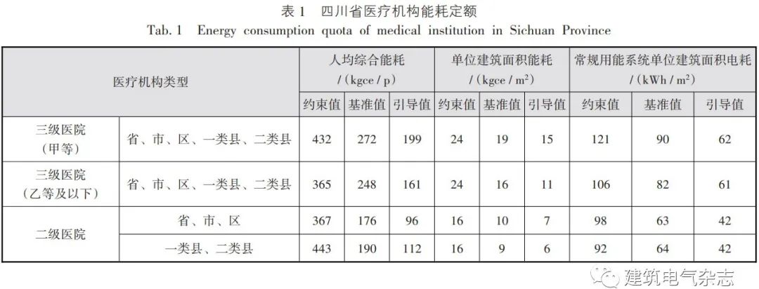 关于医院运行能耗地方政府主管部门制定了详尽的规定。DB51 / T 2762 - 2021中规定医疗建筑的运行能耗定额如表1所示。