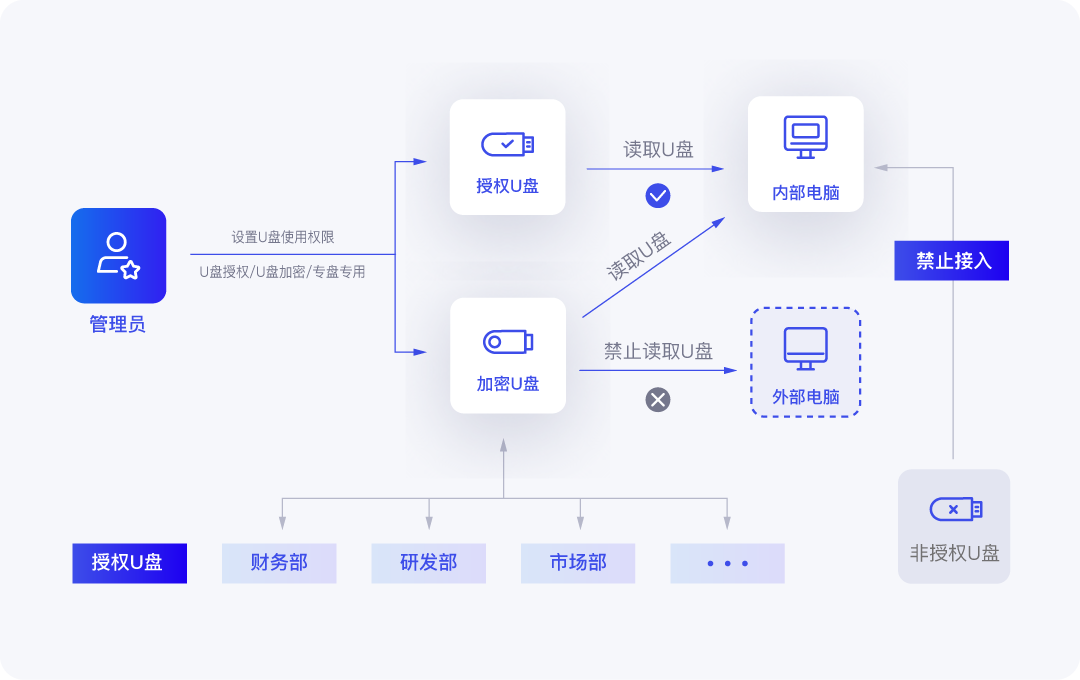 Ping32移动存储管理方案可针对企业内部设备、员工私人U盘进行统一管理,在保护文档传输安全的同时,也能防止病毒程序通过U盘传入内网。