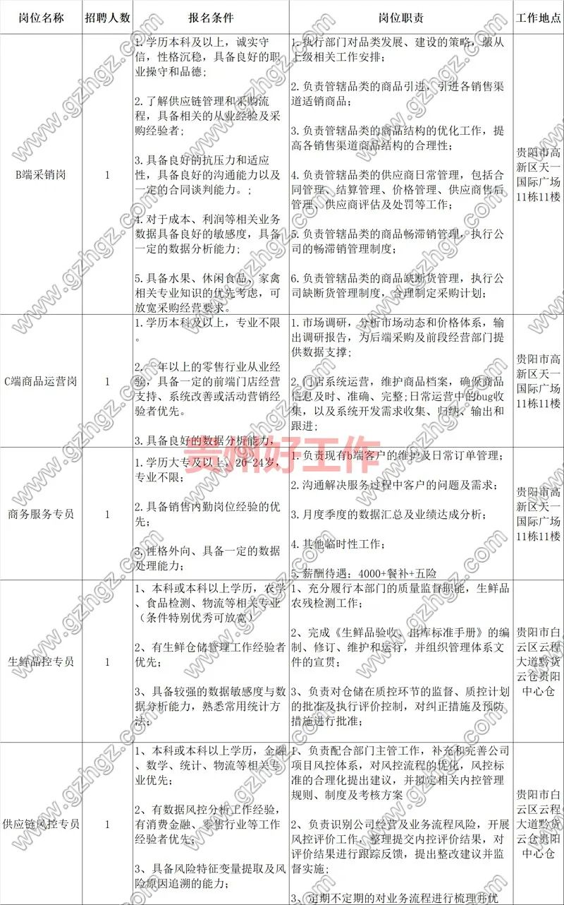 贵州美乘网络科技有限公司成立于2020年,是贵州电商云旗下生鲜供应链和新零售品牌。美乘网坚定以“产销对接”为核心的发展战略,始终坚持“创造无限,美好生活”的品牌理念,致力于建立高效快捷的农产品供应体系,通过打造数字化供应链和智慧零售品牌,持续推动生鲜供应链和零售行业的发展与创新,让更多优质黔货走出大山,为社区家庭、单位企业供给绿色、新鲜、优质的农特产品和美好的生活服务。 美乘网通过整合省内外供应商、合作社、种植基地产品资源,打造了涵盖生、食、百全品类,满足社区居民和单位团餐所需的强劲产品链,借助BEE供应链管理系统,搭建了集采购、仓储、配送等功能的一体化供应链中台,同时布局B端、C端两个渠道,围绕供应链、零售两个方向,构建了“供应链+系统+品牌”的战略定位,规划了“3+1+1”的业务发展战略,即:3个业务品牌,1个自有产品品牌,1套数字化解决方案。3个业务品牌分别是美乘集采、美乘生活、美乘团购。1个产品品牌即 美乘工坊 特色预制菜品牌。1套数字化解决方案即 BEE-数智一体化供应链管理系统 和 美乘零售云零售管理系统。 应聘者请将个人简历发送至:dinghang@gogbuy.com 注:简历投递请将PDF格式的简历以附件的形式通过邮箱直接投递 应聘报名→简历筛选→面试→择优录用→体检合格→入职。 (三)薪酬待遇:基础工资+餐补+绩效奖金、年终奖金、享受国家法定节假日、出差补助、五险一金、加班补贴、员工转正薪酬5000~8000(综合年薪8-15万,视面试情况确定)、优秀员工提供上升空间。