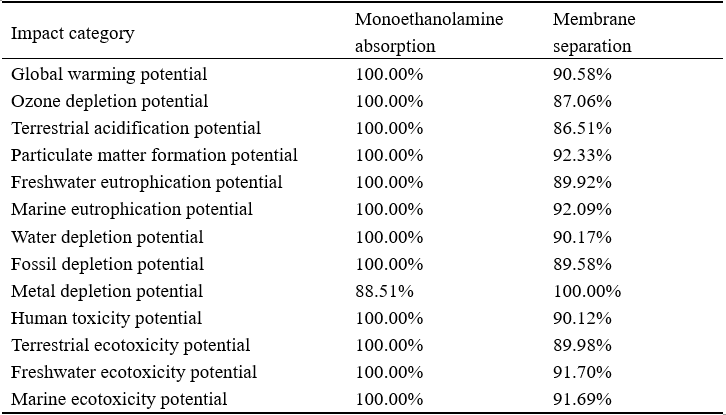 值得注意的是,电厂运行对陆地酸化和金属消耗的贡献率存在较大差距。与单乙醇胺吸收相比,膜分离电厂运行对陆地酸化和金属消耗的贡献率分别高出9.1和17.5个百分点。与膜分离相比,单乙醇胺吸收过程中的一些酸性气体会因与溶剂的反应而进一步消除。因此,单乙醇胺吸收的电厂运行对陆地酸化的贡献远低于膜分离。由于膜分离工艺中大量使用膜组件,膜分离电厂运行对金属消耗的贡献远高于单乙醇胺吸收。