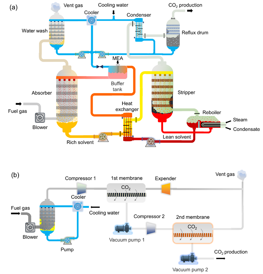 膜分离工艺为串联系统,其中来自第一级膜的渗透液作为第二级膜的进料。烟气在进行膜分离前需进行冷却降温。在第一级膜和第二级膜的进料侧和渗透侧分别布置压缩机和真空泵以提供烟气分离的驱动力。并使用膨胀机回收保留物的富余能量。
