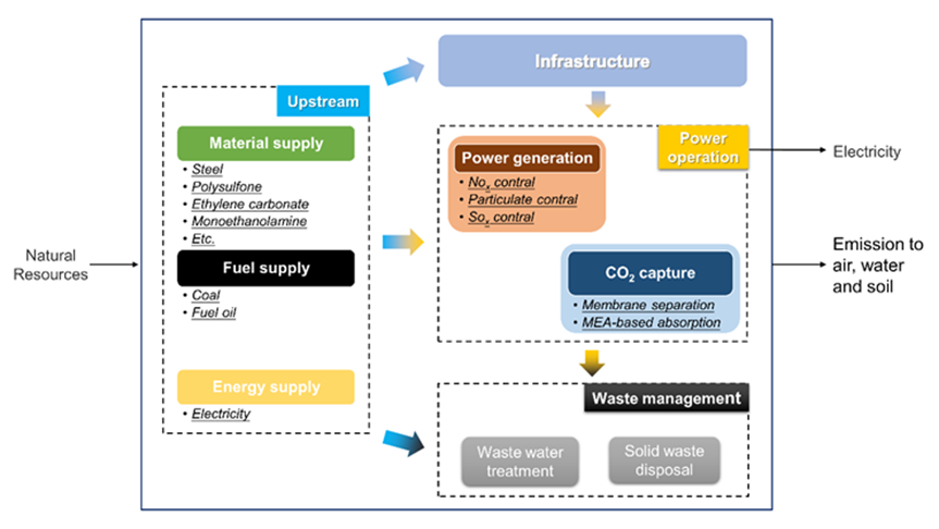 这里我们将功能单元定义为发电厂产生的1kWh电量。这与许多相关研究定义的功能单元(输送到电网的1kWh或1MWh的净功率)不同。也有少数研究以捕集的1吨CO2为功能单元,因为这些研究的对象通常是包括CO2压缩、运输和封存在内的整个碳捕集和封存链。并且无需考虑系统扩展或分配,因为电力是系统的唯一产品。理想情况下,生命周期评价研究的系统边界应包括从摇篮到坟墓的整个生命周期。但这往往会涉及大量流程,使得整个系统变得复杂。通常,研究人员会根据研究目标有意识地简化系统,原则上可以直接忽略对环境影响小于1%的过程。碳捕集与封存系统包括终端系统过程和中间单元过程,它们通过不同的中间产品连接起来。本工作的重点是比较两种不同CO2捕集过程的环境效益,因此仅考虑电厂层面的生命周期环境影响,系统边界不包括CO2运输和封存过程。