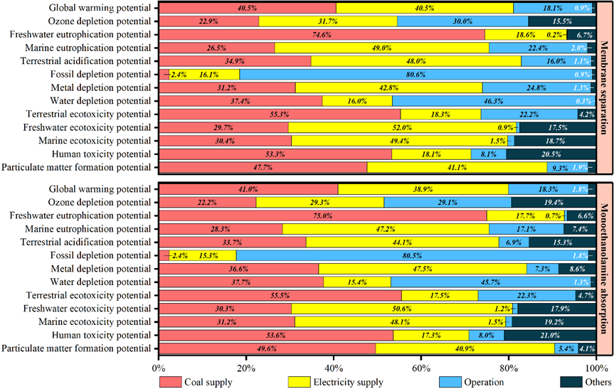 由于捕集系统燃料和能源消耗较大,在大多数环境影响类别中,煤炭供应和电力供应过程的总影响贡献都超过了70%。如图所示,在所有影响类别中,应用单乙醇胺吸收和膜分离技术的超临界煤粉电厂的煤炭供应过程的贡献分别在2.4%至75.0%和2.4%至74.6%之间。煤炭供应过程对淡水富营养化、陆地生态毒性和人体毒性的贡献率都超过了50%,其中对淡水富营养化的贡献率超过了70%。煤炭开采和洗选过程中的垃圾填埋是陆地生态毒性和人体毒性的主要影响源,废水的排放是淡水富营养化的主要影响源。