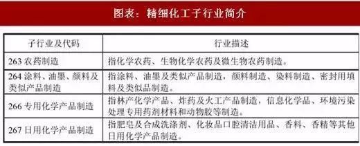 按照国民经济分类标准,精细化工分为农药制造,涂料、油墨、颜料及类似产品制造,专用化学产品制造和日用化学产品制造等4个子行业。