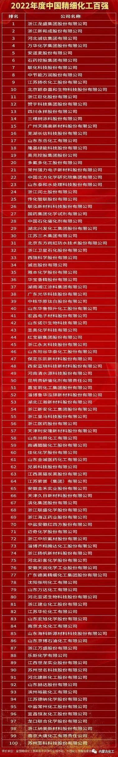 中国精细化工百强企业榜单