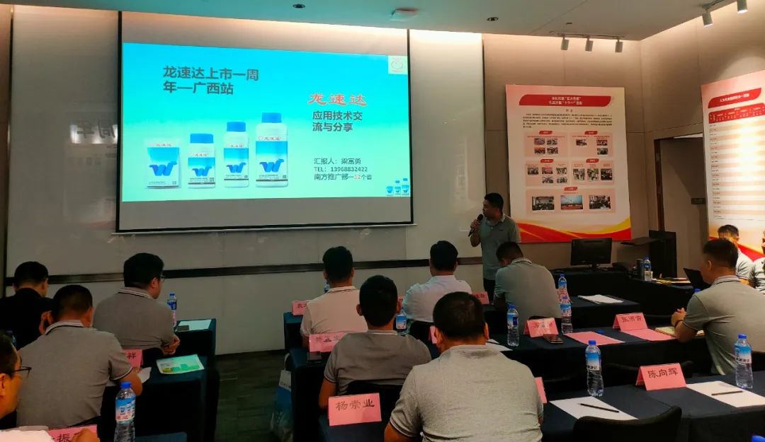 7月31日上午9点半会议准时开始,首先由西南大区经理黄正发致会议开幕辞。 接下来广西省区经理黄正焱分别讲述龙速达从产品立项、筛选配比、到产品正式登记下证严谨的发展过程,同时黄正焱经理还总结分享了龙速达上市一周年的心路历程。 然后产品经理张雨雷以丹“桂”飘香,必然速“达”为引,非常富有激情的讲解了龙速达产品,更是把整场会议推上了高潮。 同时南方推广部长梁富勇运用自己非常专业的植保知识,详细讲解了龙速达的相关应用技术,更是让广大的龙速达核心客户纷纷拿出手机争相拍照,生怕错失所分享的每个精彩的应用技术方案。 客户分享环节,西南大区经理黄正发更是别出心裁的邀请了四位不同区域代表客户上台,以座谈方式,分享了各自市场推广龙速达的成功经验和心得。 会后,在西南大区经理黄正发公布相关订货政策后,客户们纷纷踊跃订货,积极性很高。最后在一遍遍热烈的掌声中圆满落下帷幕。