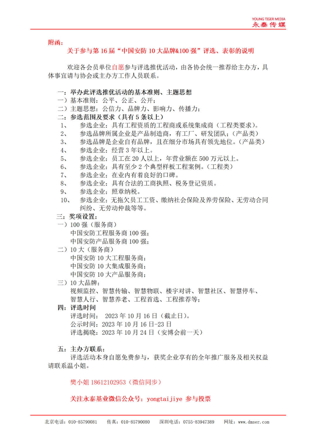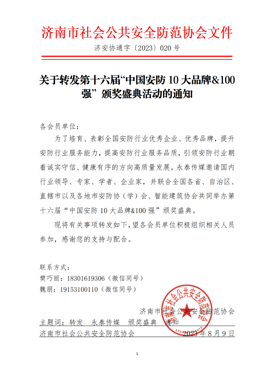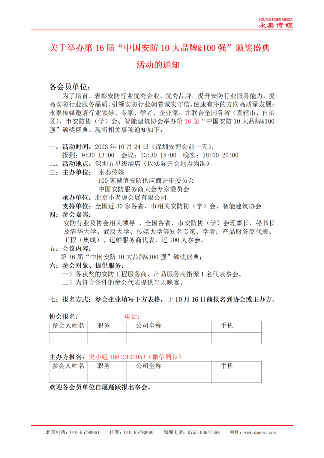 附件一:关于举办第16届“中国安防10大品牌&100强”颁奖盛典活动的通知