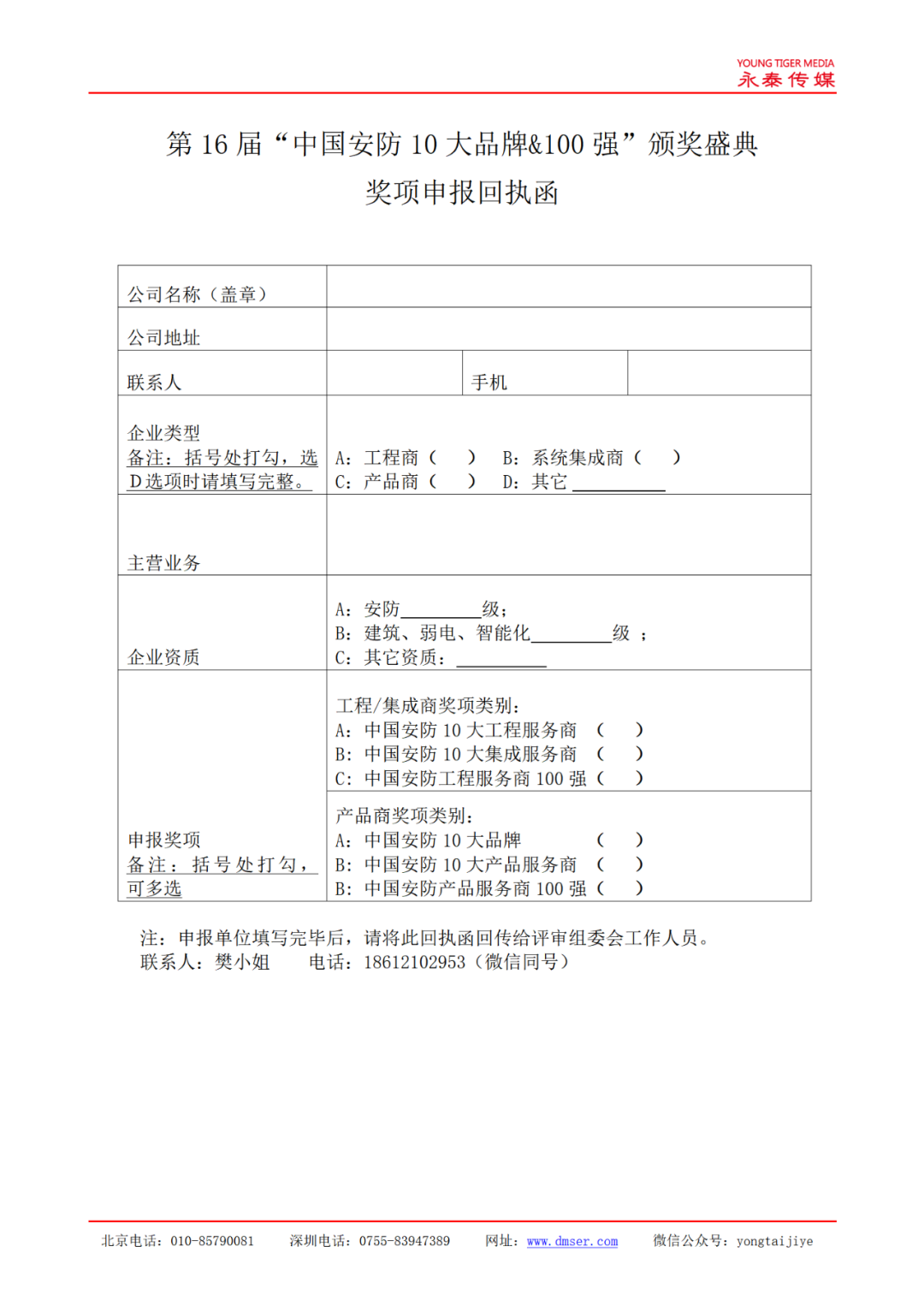 附件二:第16届“中国安防10大品牌&100强”颁奖盛典奖项申报回执函