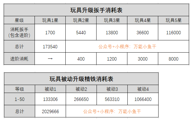 大家好,我是小鱼干。今天给大家补上玩具升级所需扳手消耗表,以及玩具被动技能升级所需精铁表,方便大家查看相关资源准备是否充足,建议图片收藏哦。