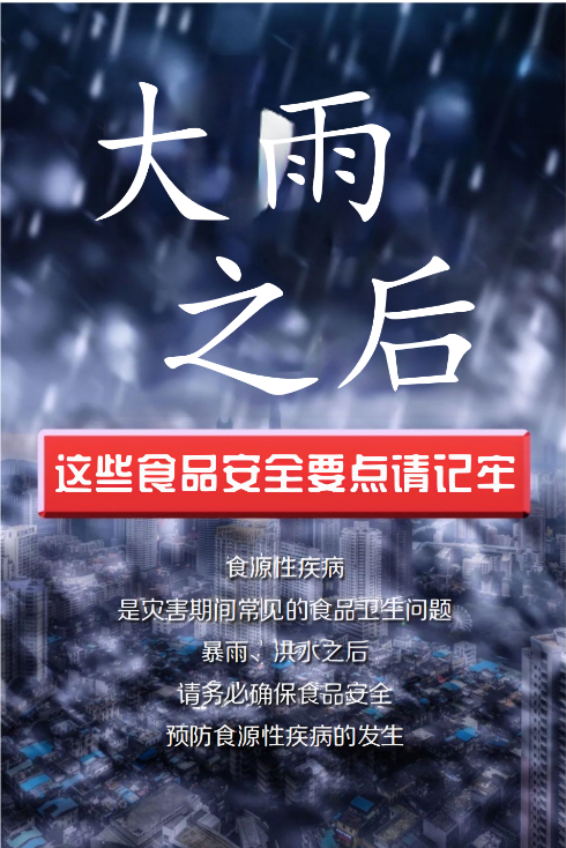 暴雨过后极易引发洪涝灾害,受灾地区卫生条件差,冷荤凉菜在制作过程中容易污染,吃了容易生病,将食物烧熟煮透最为稳妥。生食蔬菜瓜果等食物一定要用清水清洗干净后再食用。肉、蛋和水产品等需防细菌滋生,要彻底加热才能食用。