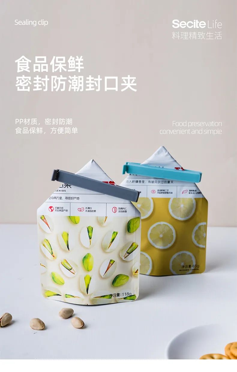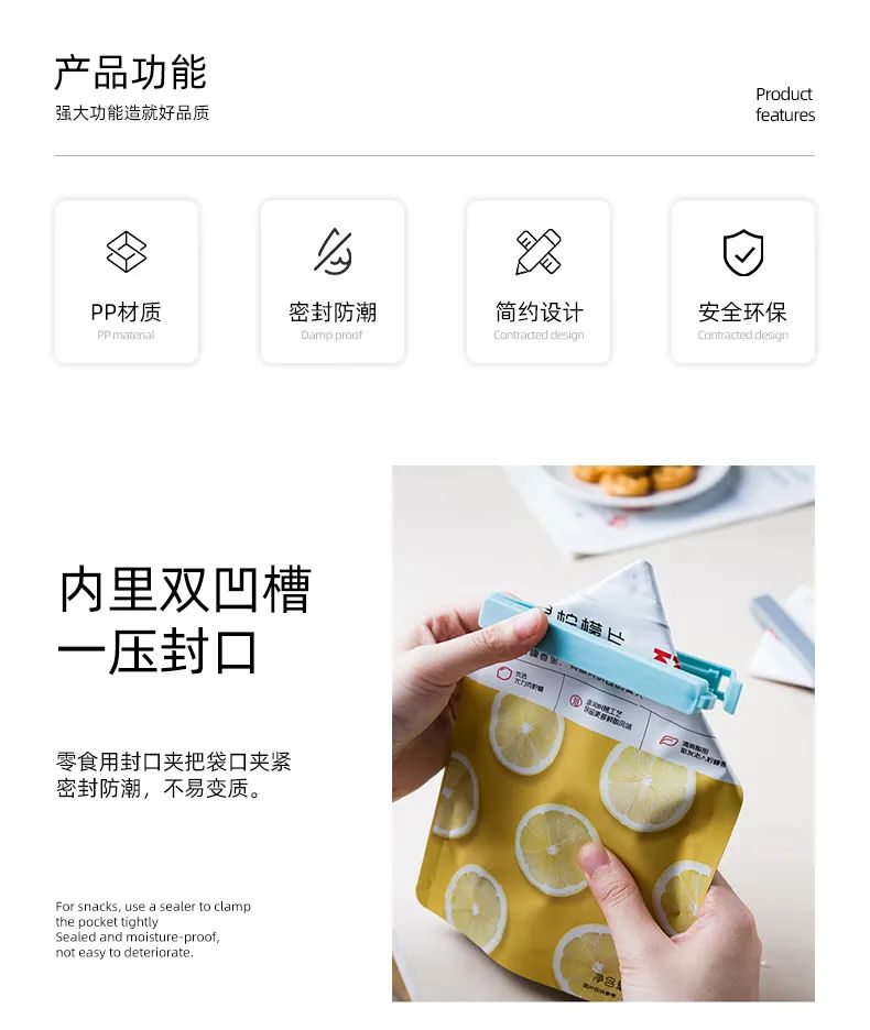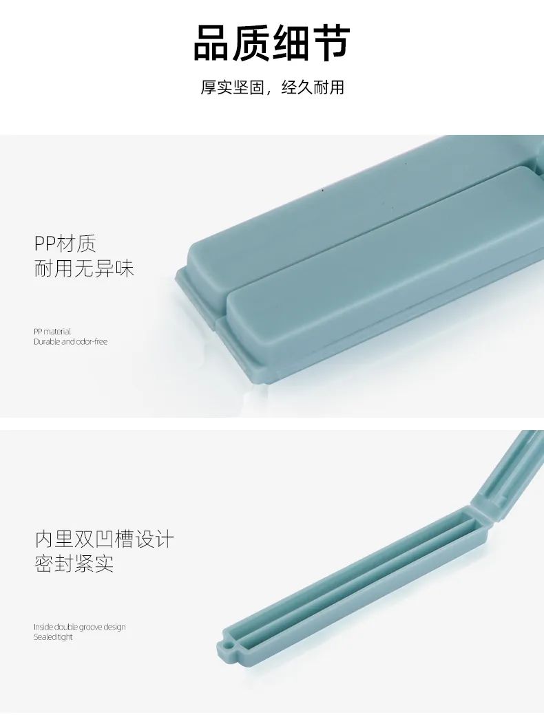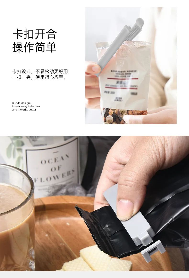 内里双凹槽,一压封口,卡扣紧实,不易松动,一口一夹,密封防潮,食物不易漏气,不易变质~