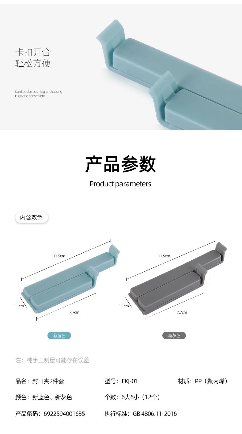 色彩素雅大方,简约设计,搭配新蓝、新灰两色,开口开合,操作简单,小巧方便收纳,保持食物新鲜。